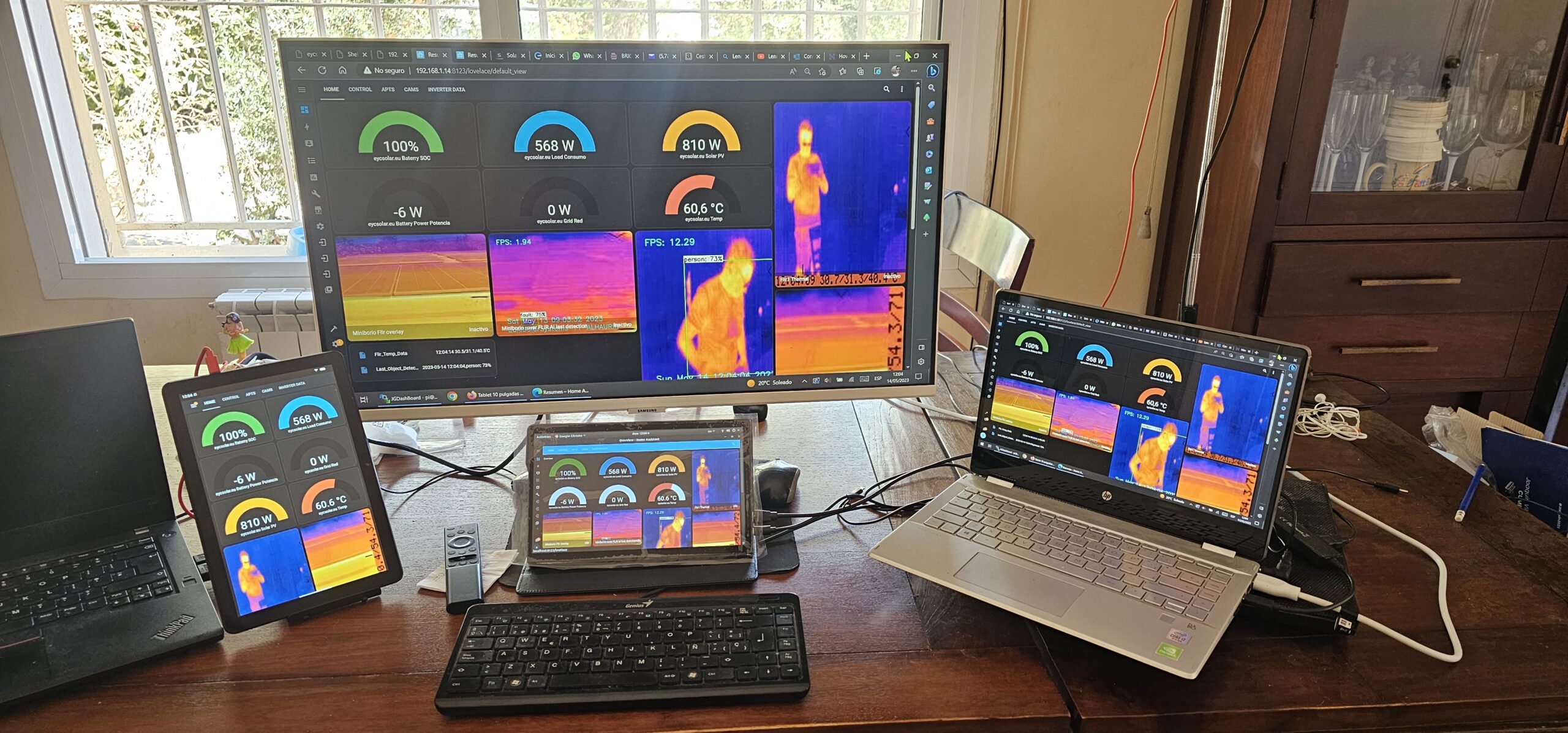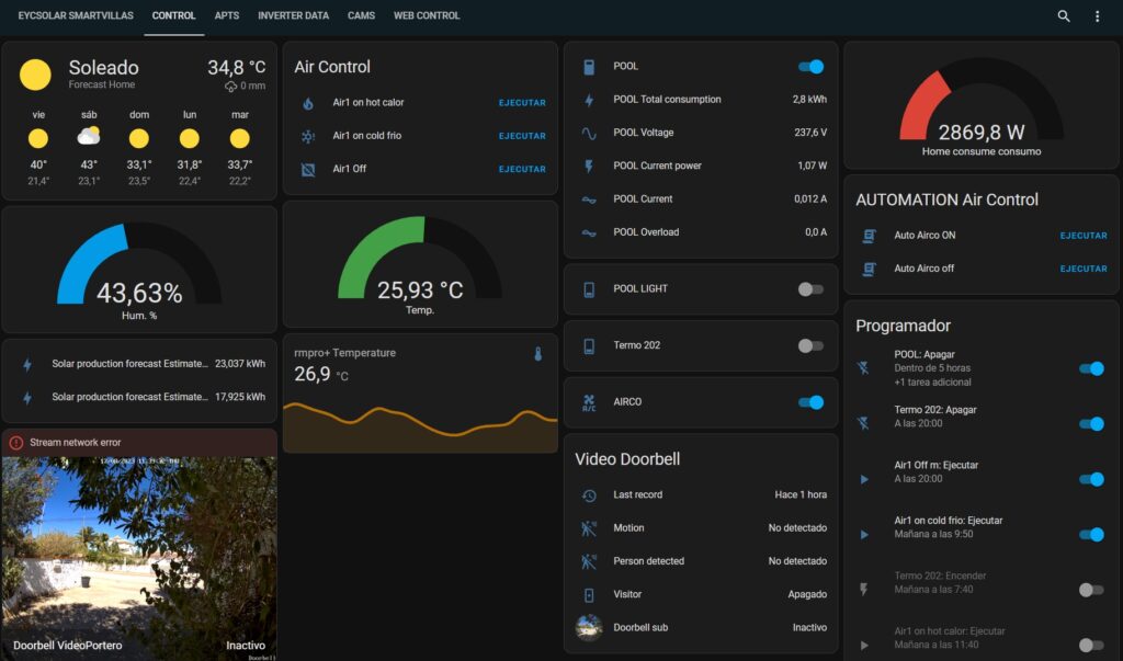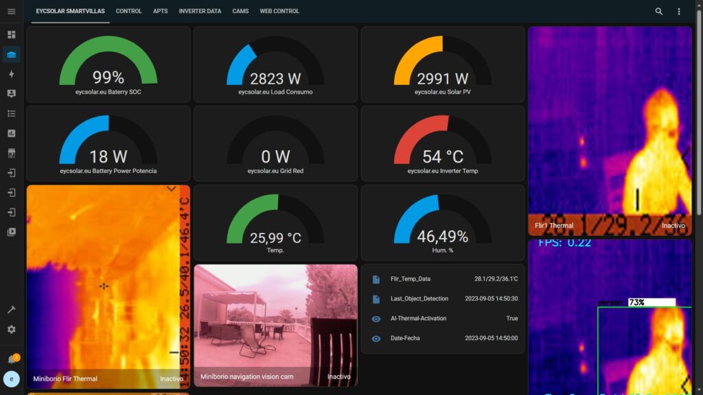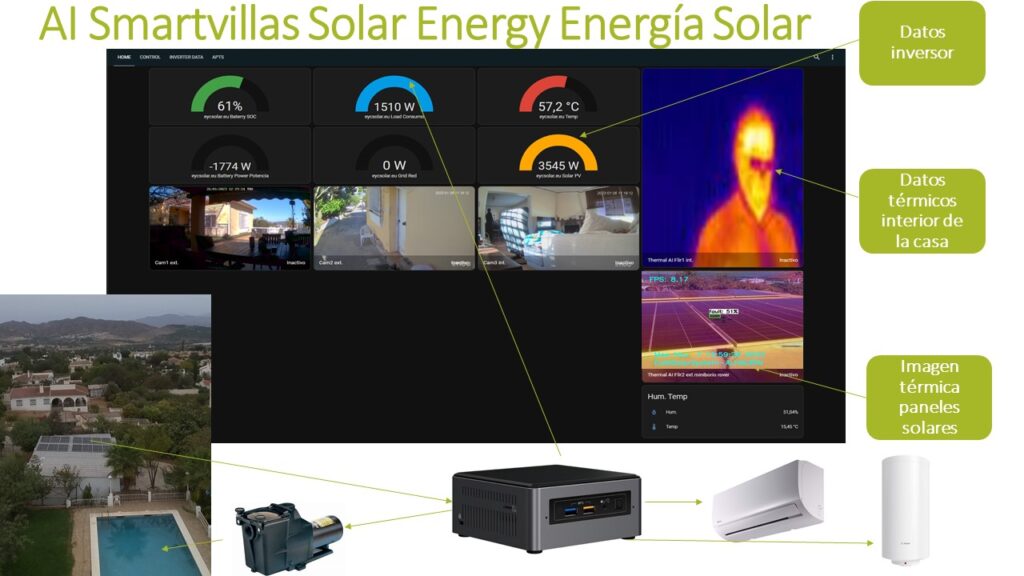 La energía de los paneles solares y de la baterías Pylontech, son analizadas por el ordenador Intel® y la inteligencia artificial, usando sensores e imágenes térmicas desde cámaras FLIR®, controla la puesta en marcha del aire acondicionado, bomba de la piscina, termo eléctrico, los grandes consumidores de energía. Compatible con varias marcas de inversores.